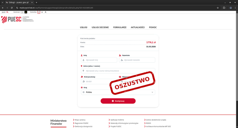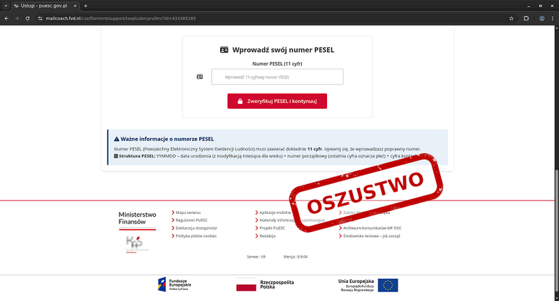 Po przejściu na stronę użytkownik proszony jest o podanie danych osobowych - w tym numeru PESEL - a następnie danych karty płatniczej. Strona może wyglądać wiarygodnie, jednak służy wyłudzeniu informacji.