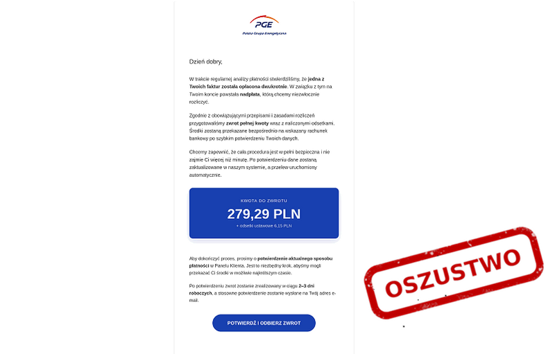 Rozliczenia i rachunki to zawsze dobry pretekst dla cyberprzestępców. W nowej odsłonie kampanii pojawia się informacja o rzekomej nadpłacie wynikającej z podwójnego opłacenia faktury.