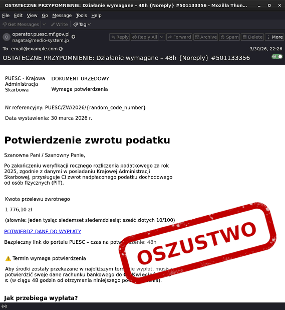 CERT Polska zaobserwował kolejną falę e-maili podszywających się pod Krajową Administrację Skarbową.