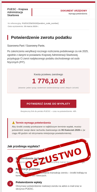 Wiadomości zawierają link do strony przypominającej Platformę Usług Elektronicznych Skarbowo-Celnych i informują o rzekomej możliwości odebrania zwrotu podatku.