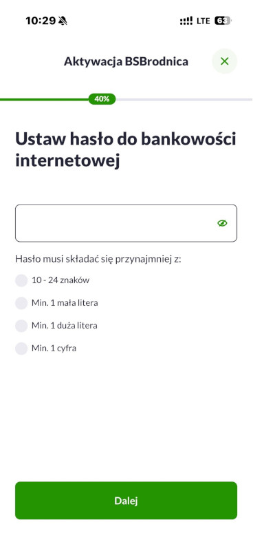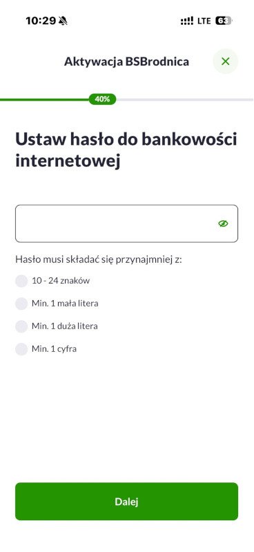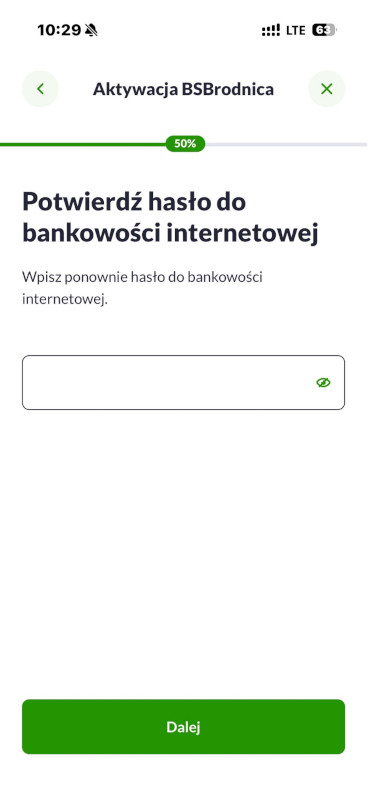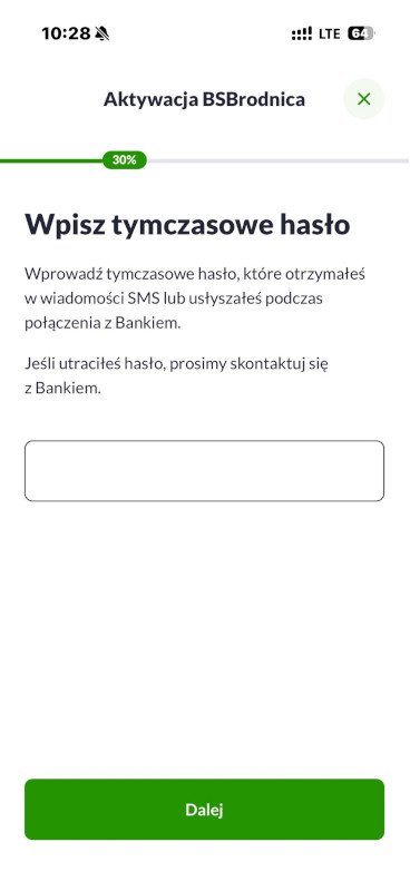 5. Jeżeli hasło nie zostało ustalone Bank wyśle do Ciebie hasło tymczasowe – przepisz je na tym ekranie. Jeżeli masz ustalone hasło - wpisz podane znaki hasła, zatwierdź je i przejdź do kroku 8.