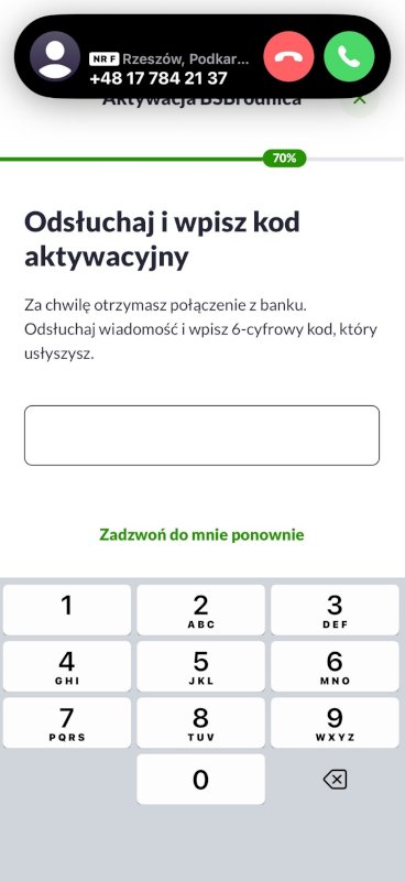 O dbieramy połączenie od Asystenta Głosowego Banku i wpisujemy w aplikacji podany przez niego kod. |