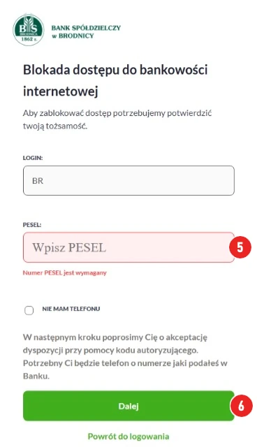 Wejdź na stronę logowania: https://bank24.bsbrodnica.pl/ i naciśnij klawisz: ZABLOKUJ DOSTĘP (1)