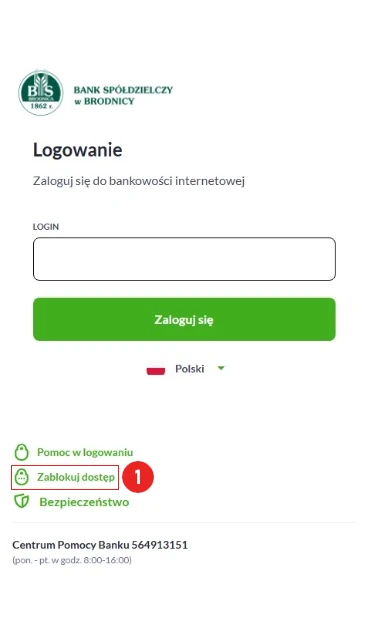 Wejdź na stronę logowania: https://bank24.bsbrodnica.pl i naciśnij klawisz: ZABLOKUJ DOSTĘP (1)