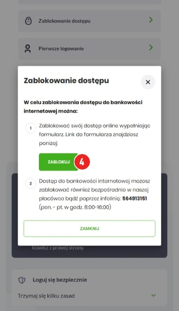 Po prawidłowym wpisaniu danych następuje zablokowanie dostępu do Bankowości Internetowej i Mobilnej.