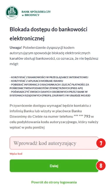 Poczekaj na telefon od Agenta Głosowego, który podyktuje kod autoryzujący - wpisz kod w polu (7) i naciśnij klawisz DALEJ (8).