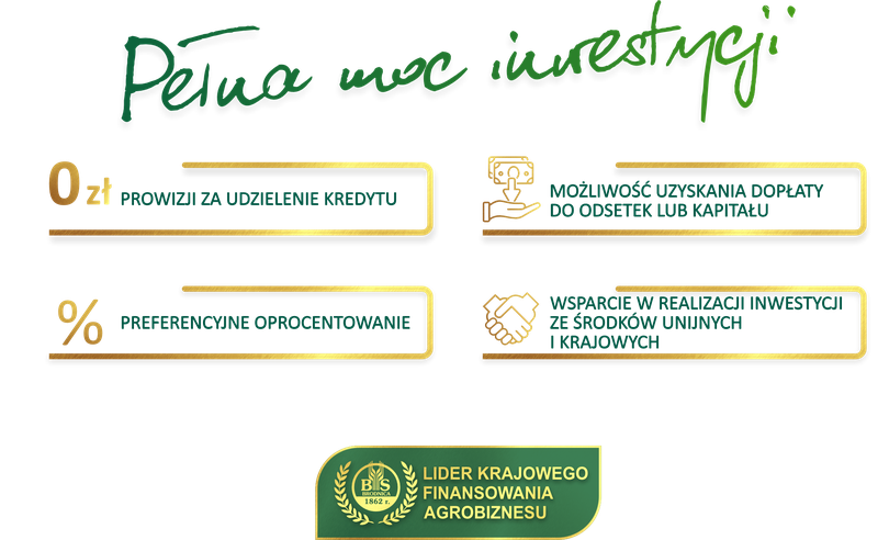 Jako Bank rozumiemy, jak ważne jest dla Ciebie rozwijanie swojego gospodarstwa i dostosowywanie go do zmieniających się warunków rynkowych. Dlatego oferujemy pomoc w dopasowaniu form wsparcia jakimi są dotacje do odsetek lub kapitału kredytu oraz preferencyjne warunki finansowania, które pomogą Ci w realizacji Twoich planów.